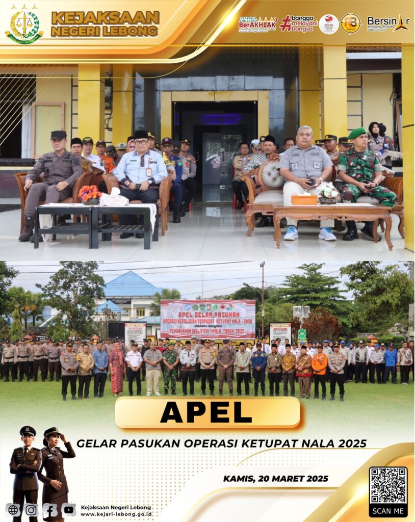 Kasi PABBB Kejaksaan Negeri Lebong mewakili Kepala Kejaksaan Negeri Lebong mengikuti Apel Gelar Pasukan Operasi Ketupat Nala 2025. Kegiatan ini bertujuan untuk memastikan kesiapan dalam pengamanan Idul Fitri 1446 H di Kabupaten Lebong. 🤝🚔