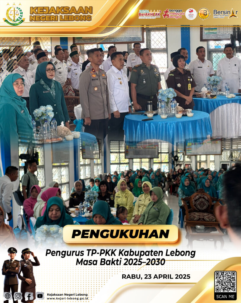 Kepala Kejaksaan Negeri Lebong yang diwakili oleh Kepala Sub Bagian Pembinaan, Surnamin Hutapea, S.Sos., S.H., menghadiri acara Pengukuhan Pengurus Tim Penggerak Pemberdayaan dan Kesejahteraan Keluarga (TP-PKK) Kabupaten Lebong Masa Bakti 2025–2030. Dalam kesempatan tersebut, beliau turut didampingi oleh Ibu Ketua IAD (Ikatan Adhyaksa Dharmakarini) Ny. Sisca Roby dan Wakil IAD Ny. Dita Bambang.