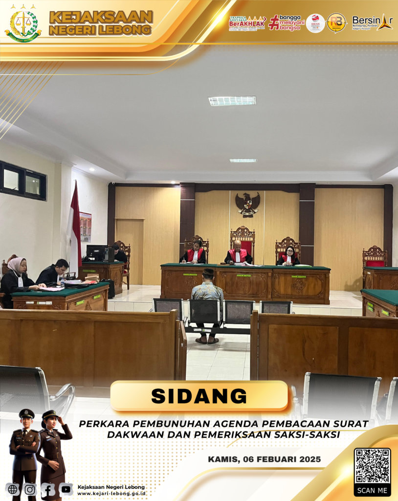 Kejaksaan Negeri Lebong menggelar sidang perkara pembunuhan dengan agenda pembacaan surat dakwaan dan pemeriksaan saksi-saksi. Dalam proses ini, surat dakwaan akan dibacakan oleh jaksa penuntut umum untuk menjelaskan secara rinci dugaan tindak pidana yang dilakukan oleh terdakwa. Selanjutnya, pemeriksaan saksi-saksi dilakukan untuk menguatkan atau menyingkap fakta terkait peristiwa pembunuhan yang terjadi.